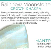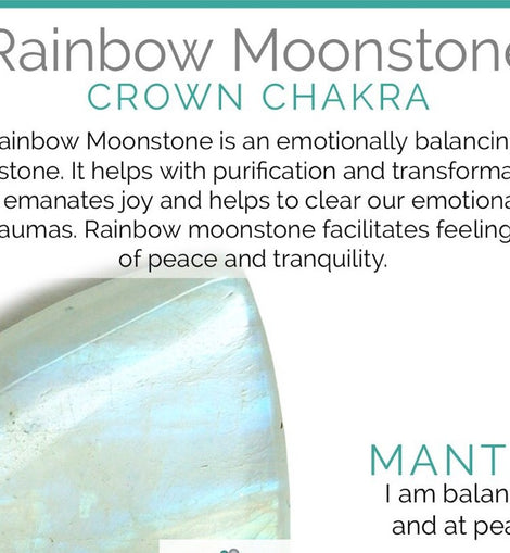 Moonstone is most commonly associated with the Heart, Throat, Third Eye and Crown Chakras.